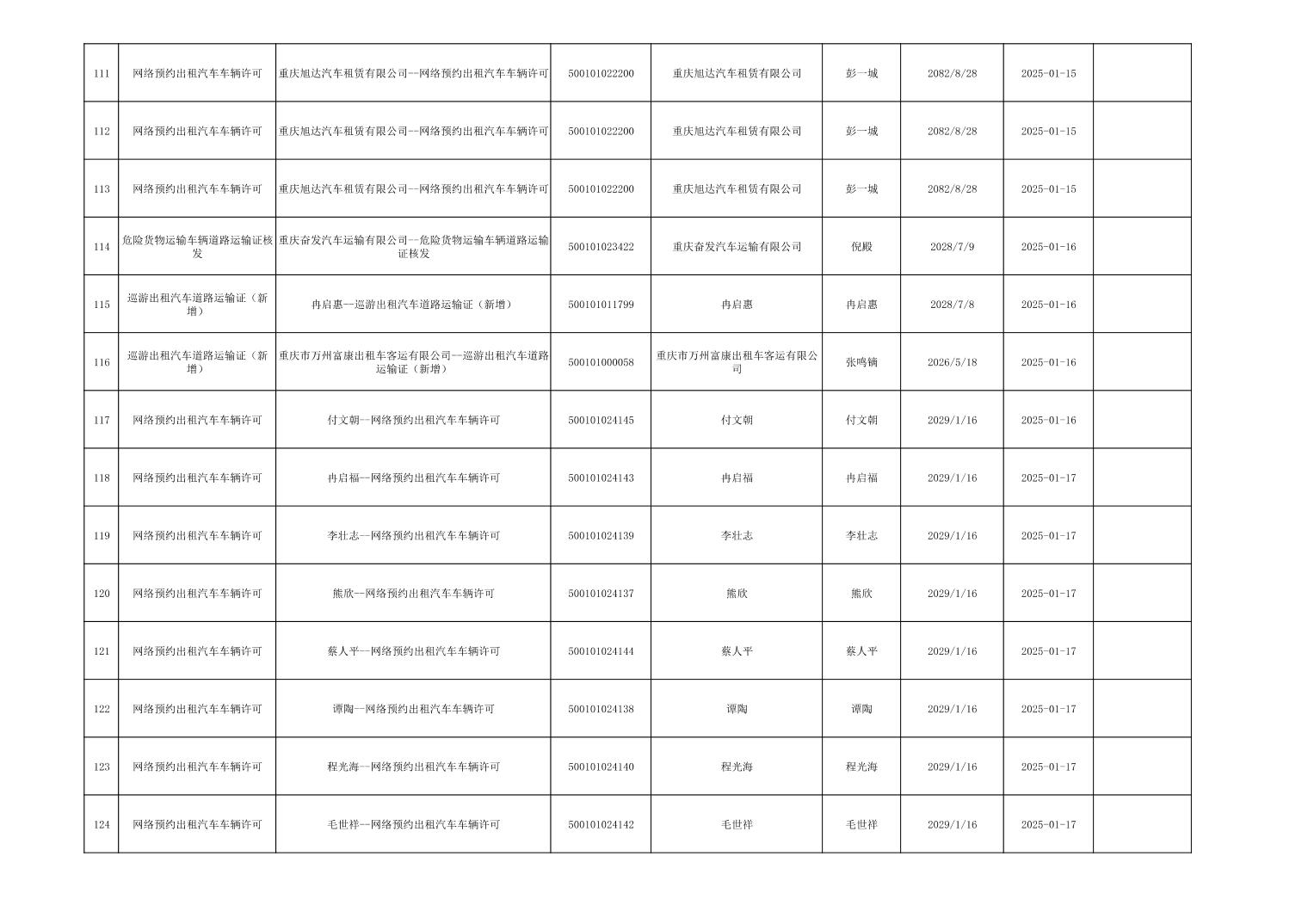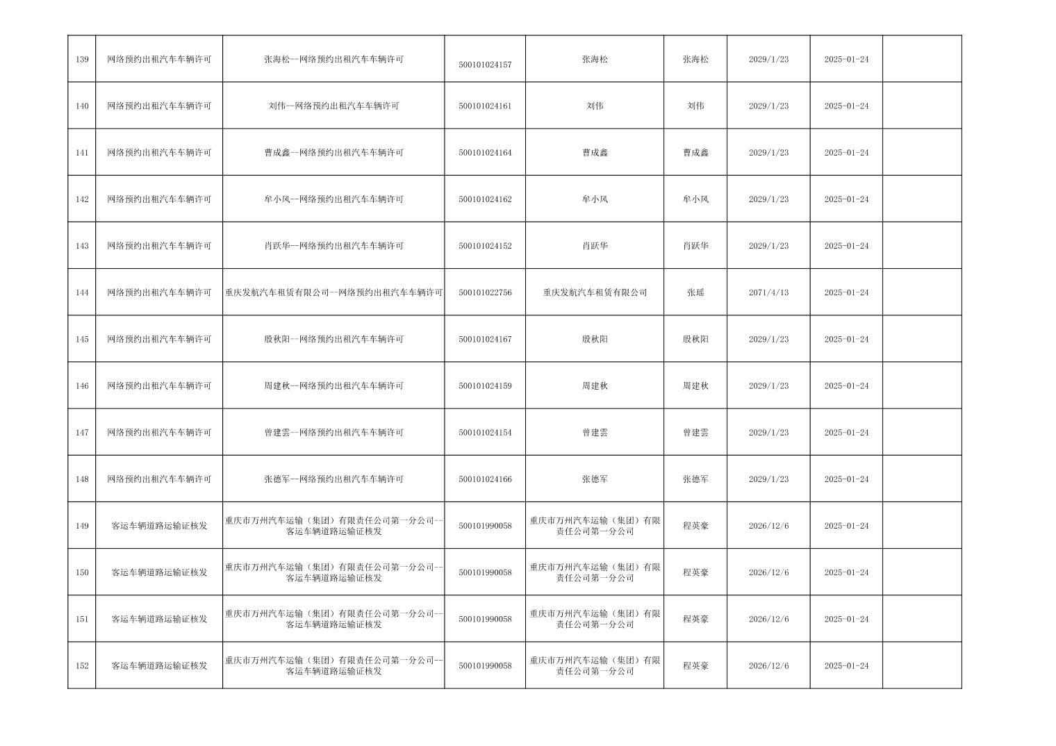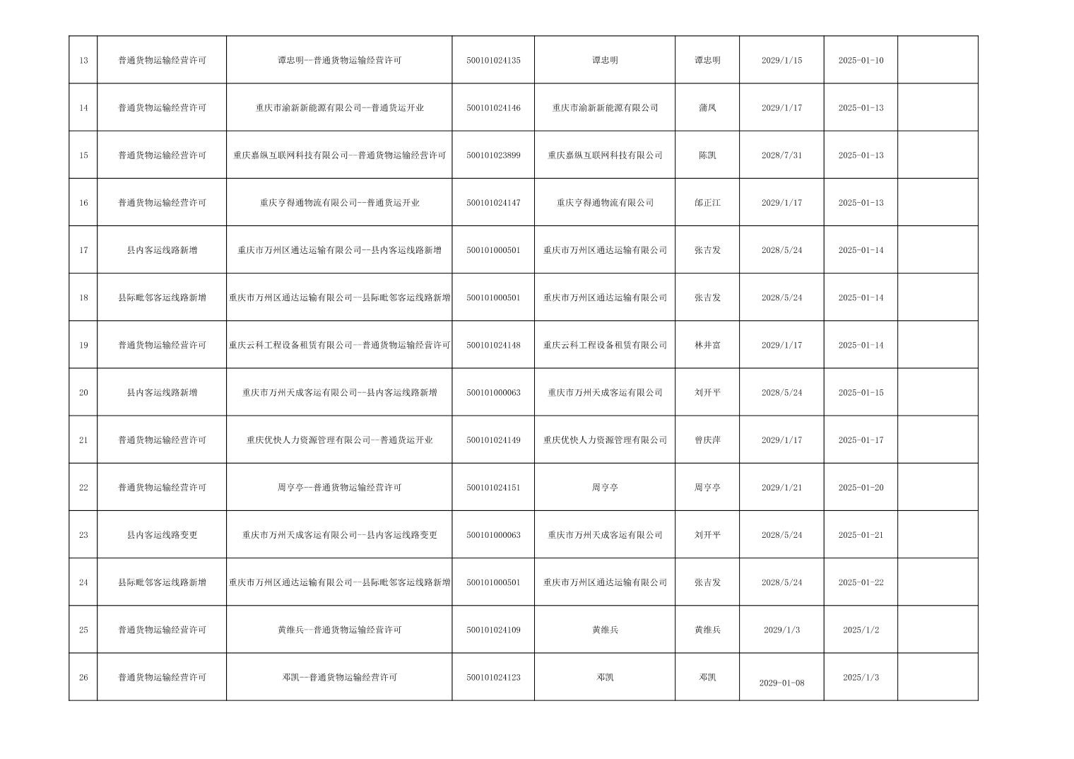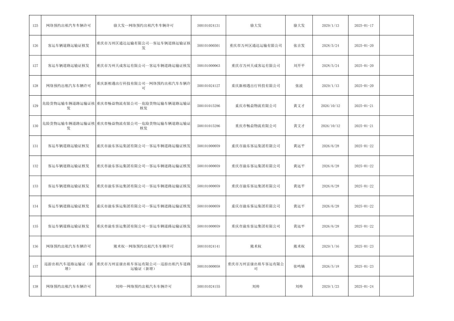 行政許可事項登記信息公示(道路運輸)2025年1月