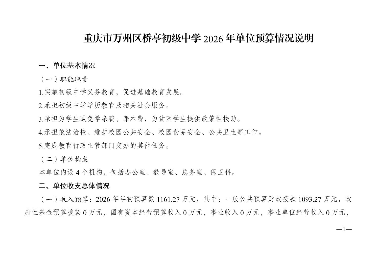 重慶市萬州區橋亭初級中學2026年單位預算情況說明