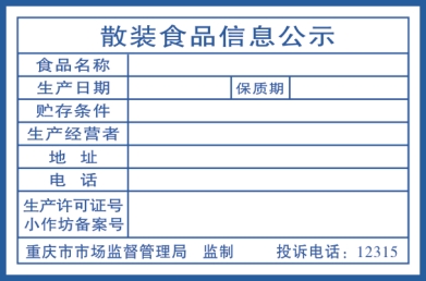 (二)食品小作坊銷售散裝食品的,應(yīng)當(dāng)在盛放該食品的容器上采用貼標或者掛牌等方式標識生產(chǎn)者名稱、產(chǎn)品名稱、生產(chǎn)日期、保質(zhì)期、貯存條件等信息;簡易包裝的,還應(yīng)當(dāng)在包裝上標識出地址、聯(lián)系方式、登記證編號、成分表(配料表)等,并清晰、醒目標識“小作坊食品”字樣。