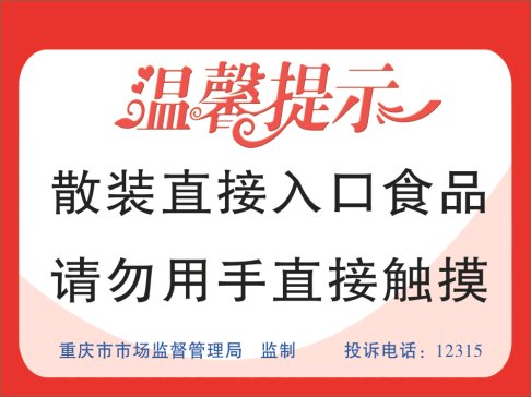 (五)供消費者直接試吃(品嘗)的樣品應(yīng)當(dāng)與銷售的散裝食品明顯區(qū)分并加蓋放置,在試吃(品嘗)位置應(yīng)配備一次性“牙簽”“叉子”“手套”等試吃工具,同時標明“試吃(品嘗)禁止用手直接拿取”等衛(wèi)生提示標牌、標語。
