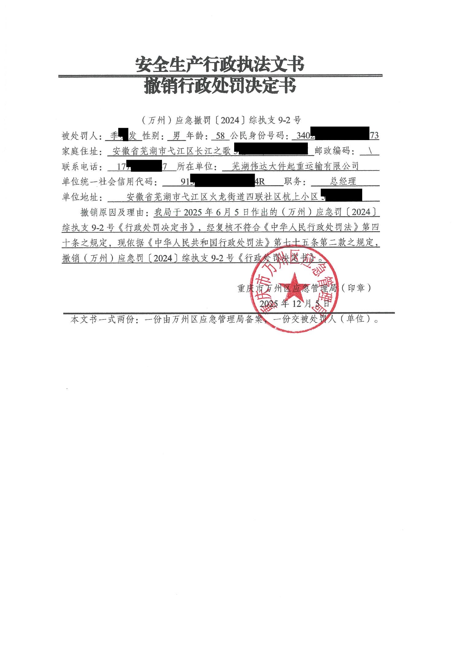 重慶市萬州區應急管理局撤銷行政處罰決定書(萬州應急撤罰〔2024〕綜執支9-2號)