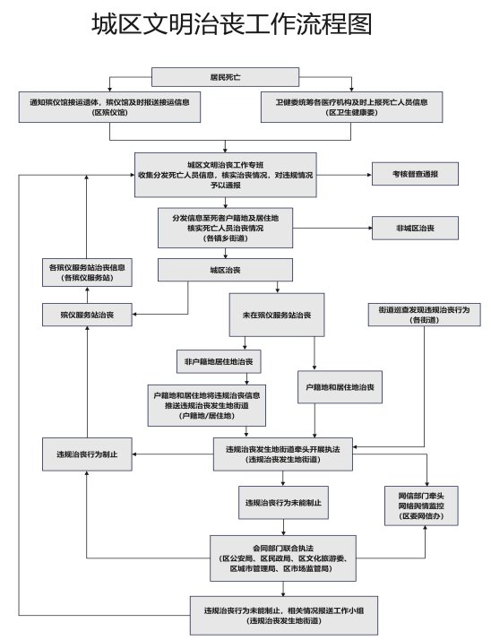 全面啟動街道全域文明治喪,街道全域治喪活動全部進入殯儀服務站,取消城區各臨時治喪點。轄區黨員、干部,尤其是行政企事業單位公職人員及其他財政資金供養人員、區人大代表、政協委員、黨外人士等,要切實發揮示范引領作用,帶動實現城區文明治喪。專班辦公室加強火化人員信息流轉跟蹤,指導逝者戶籍地、居住地和治喪活動發生地社區開展勸導引導,定期對城區文明治喪情況進行通報(工作流程詳見附件2)。