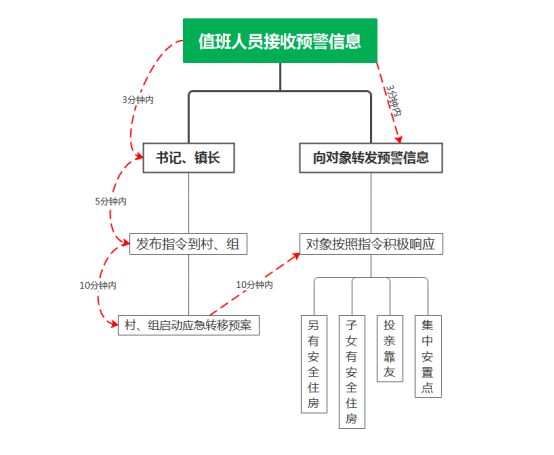 預案啟動后,鎮級指令5分鐘內傳達到村、組(監測員)一級;村、組在10分鐘內傳達到涉及居民;居民在10分鐘內按照撤離指令迅速行動。