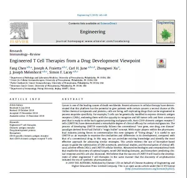 北京大學(xué)免疫系客座教授、貝賽爾特首席科學(xué)家許中偉教授與其原領(lǐng)導(dǎo)賓夕法尼亞大學(xué)Carl June教授及其課題組聯(lián)合撰寫(xiě)的綜述文章“Engineered T Cell Therapies from a Drug Development Viewpoint”,于2019年2月在中國(guó)工程院主編的“Engineering”英文版(Volume 5,lssue1,February 2019,Pages 140-149)發(fā)表。該論文主要以CD19-CAR-T細(xì)胞藥物為例,從藥物開(kāi)發(fā)角度看基因工程T細(xì)胞的設(shè)計(jì)和應(yīng)用評(píng)定。